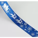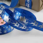 Лента атласная с рисунком 25 мм (тиснение) "Олени в упряжке" синий/серебро / 1 м